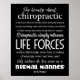 A citação do Dr. B.J. Palmer: "A beleza da quiroprática é o fato de que ela funciona com meios naturais. Não coloca nada de novo no corpo, nem retira qualquer glândula ou órgão natural. A quiroprática simplesmente libera forças de vida dentro do corpo, libera riachos de energia sobre os nervos, e permite que a natureza faça seu trabalho de maneira normal." numa variedade de tipografia/fontes.