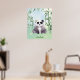 Ilustração de um urso panda preto e branco sentado perto de bambu aquarela verde. É um excelente design para amantes de pandas ou fãs de animais super fofos. As cores são pastéis e parecem uma pintura aquarela. Esta impressão vai alegrar qualquer quarto ou sala de brincar de crianças. Pode ser personalizado com o nome da sua criança.