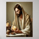 Nesta representação sagrada, Jesus se senta numa modesta mesa, vestida de roupão branco com uma simples cobertura de cabeça, exuando humildade e graça. Suas mãos suavemente quebram um pedaço de pão, executando o ato significativo que simboliza a Última Ceia. Este momento crucial na teologia cristã é um eterno que lembra o sacrifício, o amor e a unidade espiritual. Na mesa diante dele estão elementos humildes que falam muito. Dois vasos de argila descansam ao seu lado, um representando uma jarra de vinho, evocando o pacto de Seu sangue, e o outro refletindo a simplicidade. Um cesto tecido cheio de pães simboliza abundância e provisão divina, ecoando os temas de nutrição e graça encontrados em todo o ministério de Jesus. A expressão gentil e solene de Jesus transmite o seu amor inabalável pela humanidade e o profundo significado deste momento. O cenário pacífico convida os espectadores a um estado refletivo, chamando a atenção para a mensagem espiritual sobre distrações materiais. Esta representação captura a essência dos ensinamentos de Jesus, lembrando toda a sua missão altruísta e a importância da fé, do serviço e da devoção. Serve como um poderoso convite para se reconectar com a mensagem sagrada e eterna do Eucarista e de Seu amor duradouro.