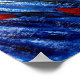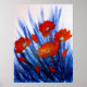 Uma pintura acrílica de papoilas vermelhas, em um campo de grama abstrato azul.