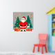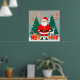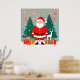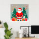 Ilustração festiva com Papai Noel cercado por árvores decoradas de Natal e caixas de presentes, evocando a alegria da época de festas cheia de celebração, amor e espírito tradicional de Natal.