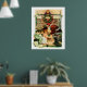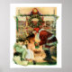 Um belo poster natal vintage com Papai Noel visitando calmamente duas crianças dormindo em frente a uma lareira.
