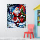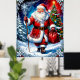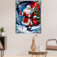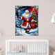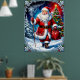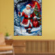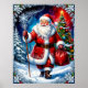 Papai Noel vestido de vermelho segurando um saco de presentes em uma cena de inverno nevado com uma árvore de Natal, flocos de neve e um céu colorido estrelado, simbolizando alegria festiva e espírito natalino.