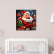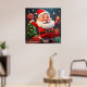 Papai Noel segurando alegremente um presente e rodeado por uma árvore de Natal decorada. A cena festiva ilustra celebração, alegria e espírito de feriado.