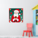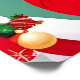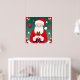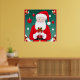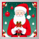 Um Papai Noel alegre, vestido tradicionalmente, tem um presente cercado por decorações e ornamentos sazonais, simbolizando a alegria e o calor da época natalícia.
