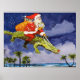Papai Noel está cavalgando um jacaré. Bastante vista. Papais noeis, com bastante recursos, treinaram jacarés para entregas na Flórida. Reindeer não se sai bem no clima da Flórida, então ele ensinou gators a voar. Papai Noel é um companheiro maravilhoso, e é assim que fazemos o Natal na Flórida. Este poster de Papais noeis único será um início de conversa para suas comemorações de feriado. Design de uma aquarela original de Mary Hamilton.