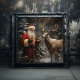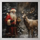 Esta é uma imagem detalhada representando Papai Noel e um cervo em uma floresta nevada. Papai Noel está vestindo um chapéu vermelho, luvas, óculos e um cinto. A cena inclui um veado marrom parado por perto. O cenário de neve melhora o tema natalício da pintura. A trabalho de arte capta o espírito festivo dos feriados com suas cores quentes e atmosfera acolhedora. A imagem é rica em detalhes, mostrando as intrincadas características do Papai Noel e do cervo como se encontram na floresta coberta de neve.