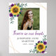 Este sinal de funeral apresenta girassóis, rosas roxas e flores, folhagens e elementos geométricos dourados falsos. Personalize-o com sua foto e texto