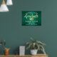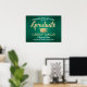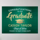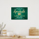 Adicione um toque personalizado a uma festa de graduação de faculdade ou segundo grau com um elegante poster de 18"x24" verde, ouro e branco. Todo texto é simples de personalizar. Design apresenta um fundo metálico esfregado verde, boné de conselho de morteiro de folha falsa, tipografia na moda moderna e caligrafia de script manuscrita. Observe que o ouro é impresso a cor, não a folha. Esta placa de festa de formatura é uma maneira elegante de celebrar o dia especial. Parabéns ao formando!