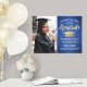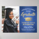 Adicione um toque personalizado a uma comemoração de faculdade ou segundo grau com uma foto personalizada azul real, ouro e poster branco de 18"x24". Imagem e todo texto são simples de personalizar. A design apresenta um fundo metálico azul esfregado, boné de conselho de morteiro de folha falsa, tipografia moderna, caligrafia de na moda e uma foto do formando, como uma fotografia de mais velho ou imagem da cerimônia de início. Observe que o ouro é impresso a cor, não a folha. Esta placa de festa de formatura é uma maneira elegante de celebrar o dia especial. Parabéns ao formando!