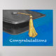 Você ou alguém que você conhece está se formando! Sim! Envie suas parabéns com nosso design na moda apresentando nossa arte original de um boné de formatura azul com uma fita amarela contra um fundo preto texturizado e a palavra, Parabéns no fundo. Designs personalizados disponíveis.