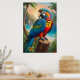 A vibrante arara tropical do Havaí se coloca sobre um toco de madeira com um fundo paraíso tropical. Bela ave com cores amarela, azul, vermelha, verde e laranja. Este cenário tropical inclui palmeiras, ilhas, praias, ondas de água tropical e plantas dos trópicos.