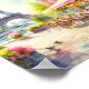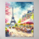 Este postal apresenta um retrato aquoso da Torre Eiffel em Paris, França.