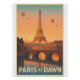 Design retrô chamado "Paris no amanhecer", mostrando a Torre Eiffel no nascer do sol. O céu brilha com gradientes suaves de cor-de-rosa pastel, laranja e azul-claro como a primeira luz solar