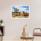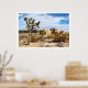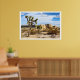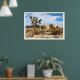 Foto de Joshua árvores, rochas e areia contra um céu azul no Parque Nacional Joshua Tree. Texto personalizável/removível, "Árvore de Joshua" impressa no canto inferior direito.