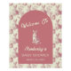 Bem-vindos aos seus amigos e família ao seu chá de fraldas com este poster com um encantador padrão floral de toile com belos coelhos e naves e matizes rosa.