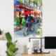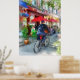 Designs de Susan Savad — Era o dia do Festival de Arte e Música em Hoboken e as ruas estavam lotadas de pessoas olhando para as cabines. O único lugar que sobrou para este homem andar de bicicleta foi na calçada, passando pelo café, com os guarda-chuvas vermelhos brilhantes a serem cuidadosos em dar aos pedestres o direito de passagem.