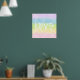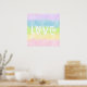 A simples inscrição manuscrita de "LOVE" com forma cardíaca e uma seta no arco-íris pastel.
