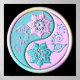 A yin yang symbol is designed with intricate floral patterns in pastel colors. The delicate flowers are complemented by swirling leaves inside the emblem.