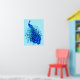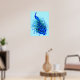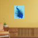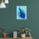 Poster num pavão fantástico com uma cauda lavada, em tons de turquesa profunda e azul de cobalto, num fundo aquático macio