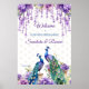 Peacock e flores roxas aquarelas Indianas casamento modelo com sinal de boas-vindas poster imediatamente digital. Dois belos pavões, flores roxas de jasmim, wisteria, flores penduradas e terras bem-vindas sinal poster