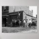 Escola de bombeiros, 1920. Um bombeiro saltando de um telhado para um trampolim de segurança de um bombeiro.