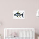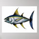 um trabalho de arte decorativo de um grande atum com barbatanas amarelas e azuis nadando ao longo. um design excelente para fãs de marisco e pesca.