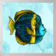 Poster de peixe engraçado com um trabalho de arte digital representando um peixe-anjo tropical giro com pestanas longas em adoráveis cores azul e amarela. Excelente adicional a uma decoração de quarto de berçário sob o tema Mar.