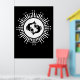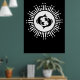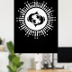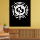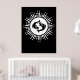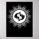 Este design a preto e branco, em negrito, apresenta o símbolo do Peixes zodíaco com dois peixes espelhados no centro, rodeados por um padrão de explosão radiante. O layout circular é acentuado com linhas radiantes e estrelas cintilantes, criando um efeito celeste impressionante. Seu claro contraste e tema cósmico capturam uma vibração mística e moderna perfeita para entusiastas da astrologia e sonhadores.