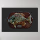 Esta imagem apresenta um troféu de solários mais comprido, exibindo uma água fresca sunfish Longear, com um nome de etiqueta por baixo do peixe, montado numa placa de madeira.