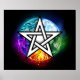 Pentagrama luminoso desenhado artificialmente com cinco elementos mágicos, água, terra, fogo, astral, ar sobre fundo negro. Pentagrama Wiccan. Wicca