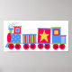 Comboio de desenho animado em azul médio, vermelho e ouro.
