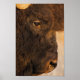 Feche a fotografia do rosto de um Buffalo. Tirada no Parque Estadual de Antelope, em Utah, de manhã cedo. O céu da manhã azul pode ser visto refletido em seus olhos.