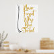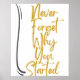 Um design gráfico inspirador com a frase "Nunca se esqueça do porquê de você ter começado" em uma fonte atraente escrita à mão com toques de ouro, sugerindo elegância e motivação.