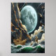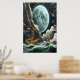 Um pescador solitário lança sua linha sob o brilho de uma lua grande, aninhado entre penhascos torrenciais. Um pequeno veleiro está ancorado nas proximidades, com ondas suavemente batendo ao seu redor. A cena é surreal e etérea, com qualidade de sonho.