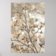 Pessegueiro de flores, design de poster esticado floral, esticado, com um galho castanho florescente com flores de pêssego bonito e um pássaro no marfim verde, bege, fundo esticado. Você pode adicionar texto se desejar. O pêssego pode ser mudado para qualquer cor. Basta clicar em "Personalizar botão".