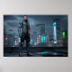 Uma imagem fotorealista e espantosa de uma pessoa cibernética melhorada que se encontra em pé num telhado, com uma cidade ciberpunk, iluminada por neon, a espalhar-se ao fundo. A design destaca os membros mecânicos detalhados do personagem e roupas modernas e de alta tecnologia, criando um retrato poderoso e futurista perfeito para fãs de ficção científica e ciberpunk.