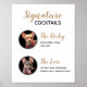 Este design de menu apresenta "Signature Cocktails" com dois quadros para adicionar seu próprio cachorro, gato ou outras fotos de animais de estimação. Substitua o texto por seus nomes de animais de estimação como títulos de bebida e substitua as descrições pelos ingredientes de bebida de sua escolha. Você também pode mudar as cores do texto para corresponder ao seu tema de casamento.