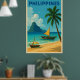 Bring the paradise of the Philippines into your space with this vibrant vintage-style travel poster. Featuring a tranquil tropical beach scene with traditional Filipino boats, clear turquoise waters, a leaning palm tree, and the iconic limestone cliffs in the distance, this artwork perfectly captures the charm and natural beauty of the islands. Ideal for beach lovers, travel enthusiasts, and tropical decor fans, this piece adds a warm, adventurous touch to any home, office, or travel-themed space.