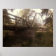 The image depicts an isolated wrought-iron bridge spanning a creek, situated next to lush greenery in a rural or parks-like setting. The bridge's metal framework provides structural support, connected to the ground by stone-like piers, and spans the creek through a cleft, finally leading into another set of wheels.