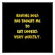 Texto amarelo sobre um fundo negro exprime com humor o desafio de comer biscoitos silenciosamente ao redor dos cães. A frase ressalta o sentido profundo dos cães ouvidos quando se trata de lanches.
