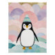 Esta encantadora ilustração apresenta um pinguim caprichoso centrado contra um pano de fundo de suaves colinas semicirculares sobrepostas. A paleta é uma paisagem onírica suave de tons pastel rosa, lavandas e verdes-menta, executada com uma textura delicada de aquarela que sugere uma paisagem mágica e nevada. O próprio pinguim usa um gorro azul-turquesa acolchoado e estampado, adicionando um toque de personalidade e calor ao cenário frio. Acentos sutis de folha de ouro no céu e em uma esfera celeste flutuante fornecem um toque de elegância de conto de fadas, misturando design de personagem minimalista com padrões inspirados na arte popular.