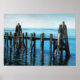 Um velho cais vazio, amassado, aguarda o regresso dos barcos que estão fora do mar. Pintura original de Jason Girard em acrílicas. Inspiração de férias.