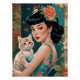 Esta ilustração encantadora irradia elegância vintage! Um pin-up asiático com cabelo escuro e elegante, enfeitado com berços de flores de laranja vibrantes, um gatinho de mesa liso, com um colar vermelho. Ela está vestida com um vestido floral teal, seu padrão delicado complementado por seu colar de pérolas e brincos elegantes. O fundo floresce com rosas cor-de-rosa macio e borboletas flamejantes, colocadas contra um pano de fundo rico, criando uma cena sonhadora, romântica. Perfeito para fãs de arte clássica com um toque de charme felino!