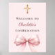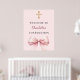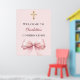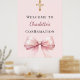 A large pink bow and a golden cross as decoration. A soft, blush pink background. Personalize and add her name.