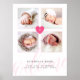 Adorable nursery decor featuring four photos of your sweet baby girl, with a heart-shaped monogram, and your baby's name and birth stats written atop a pale pink "welcome" written in a beautiful calligraphy script.