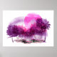 pink, purple silhouette of trees against the background of sunset, sunrise, red, pink sun. Vintage illustration. Watercolor landscape, forest