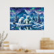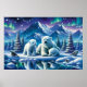 Uma mãe urso polar e seus dois filhotes estão sentados em um banco coberto de neve em frente a um lago congelado. Os pinheiros cobertos de neve alinham o fundo sob um céu noturno cheio de luzes Nortes. Várias pequenas aves descansam nas margens de neve do lago. O reflexo dos ursos e os nadadores aurora borealis na água.