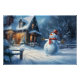 Uma agradável, colorida pintura de inverno de um boneco de neve fora de uma casa.