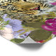 Um leopardo feroz sai de um conjunto de flores coloridas.